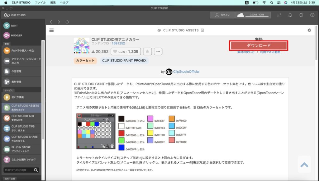 「CLIP STUDIO用アニメカラー」をダウンロードします。