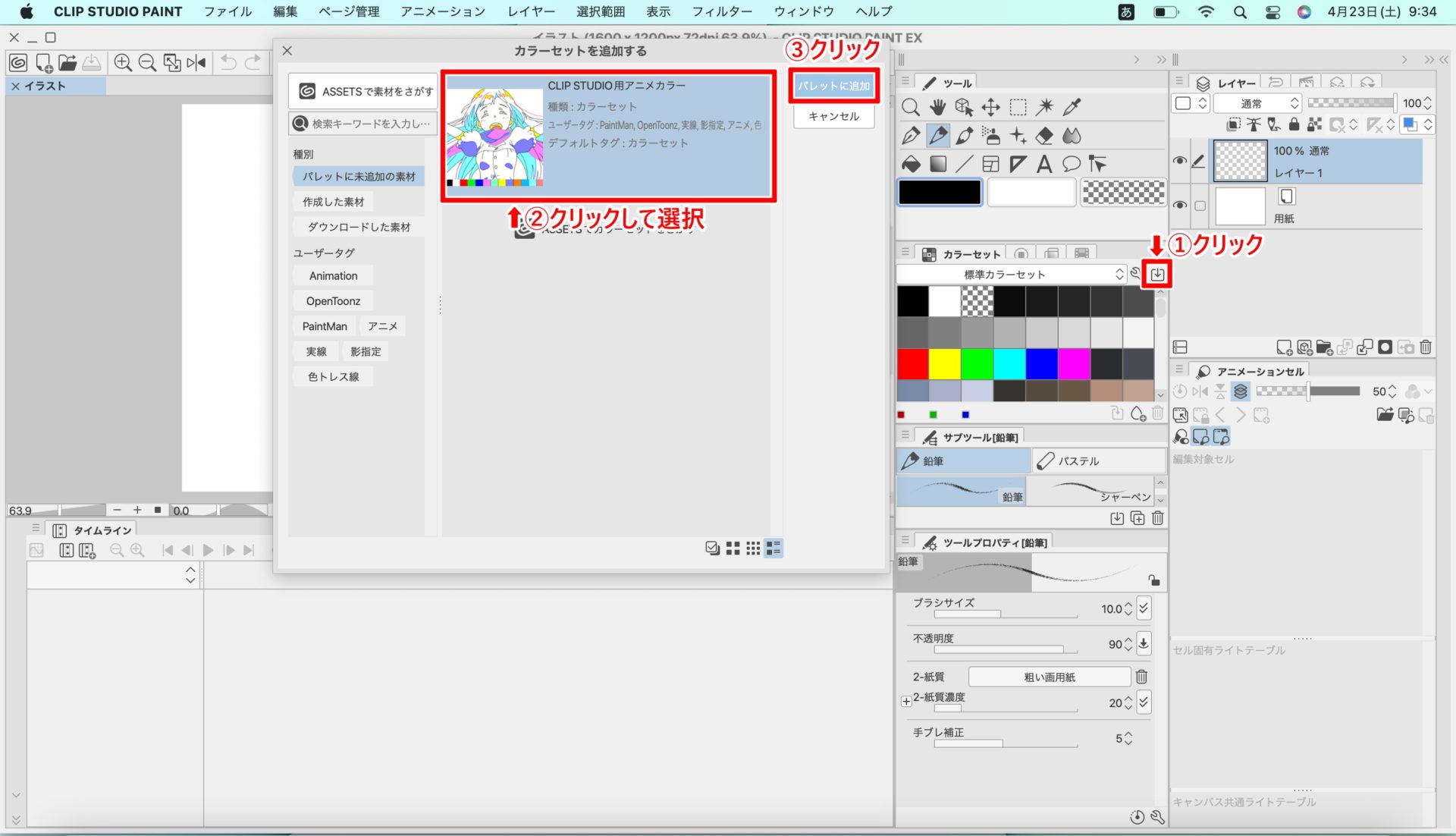 カラーセットウインドウの一番右のアイコンをクリックし(①)、「カラーセットを追加する」ダイアログから「CLIP STUDIO用アニメカラー」を選択します(②)。