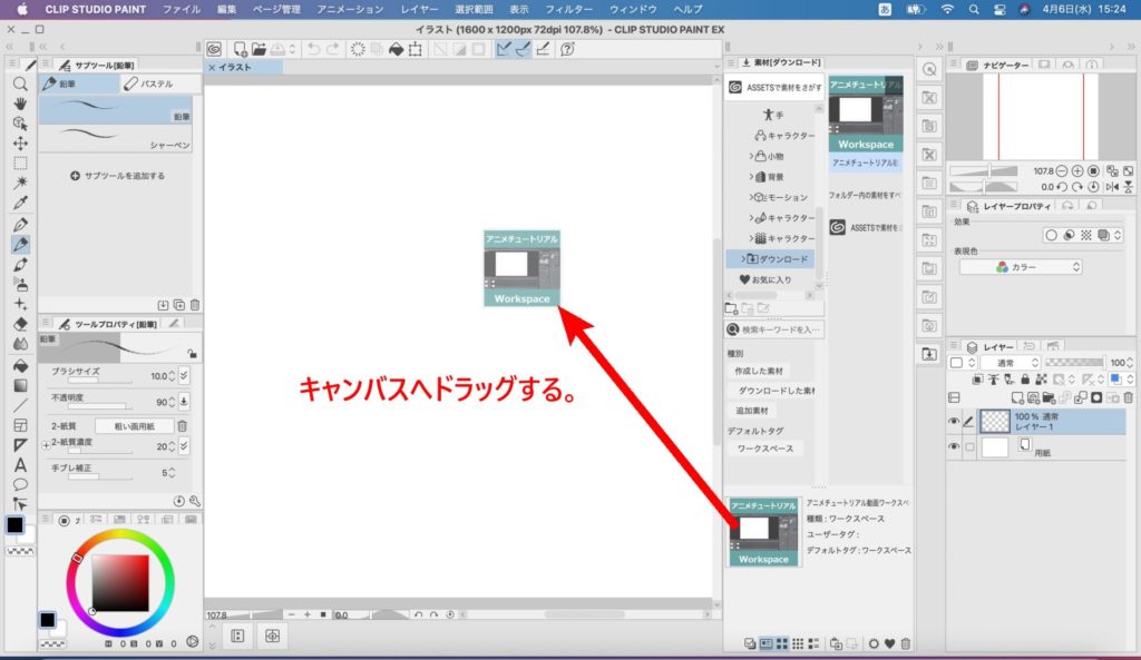 「アニメチュートリアル動画ワークスペース」を選択して、キャンバスにドラッグします。
