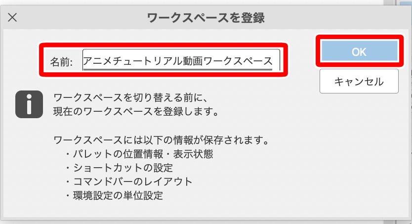 「ワークスペースを登録」ダイアログが表示されますので、任意の名前を付けてOKをクリックします。