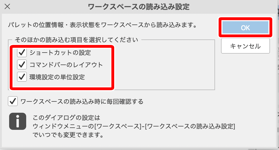 「ワークスペースの読み込み設定」ダイアログが表示されますので、全ての項目チェックが入っているのを確認して、OKをクリックします。