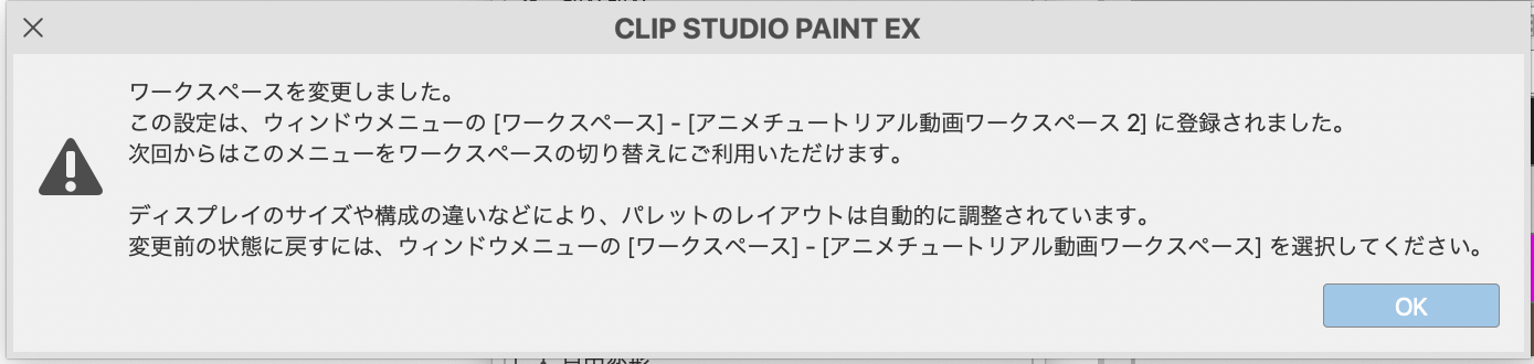 ワークスペースの変更メッセージが表示されるので、OKをクリックします。
