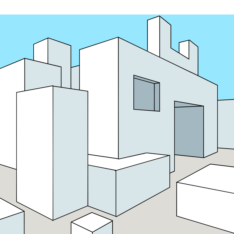 一点透視図法から二点透視図法の差は消失点が1つから二つに増えただけですが、消失点が2つに増えた事で広大な空間表現が可能です。