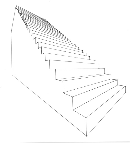 左上の図の窓の奥に階段が描かれているが、この階段もまたパースによる消失点を建物と同じく影響を受けています。