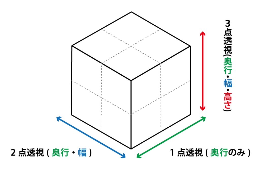 二点透視図法から三点透視図法の差は、消失点が2つから3つに増えただけです。