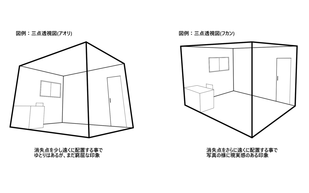 画は三点透視図の表現図としての代表的なモノですが、基本的な図案としては各消失点を大きく画面外に設定し、写真で撮影した様に「自然に見える図案」として描くと良いでしょう。