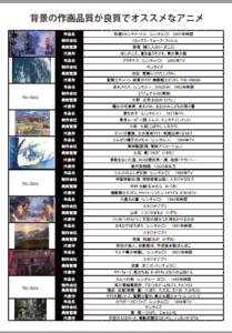 背景イラスト専科を担当していた時のオススメアニメです。配信(アマプラ、ネトフリ等)の状況については、「作品名 配信」にて調べて下さい💦