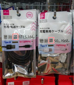 殆どのUSBケーブルは充電・データ転送両方兼用のケーブルが殆どですが、100均に売られているUSBケーブルは「充電用」と書かれている事もあります。