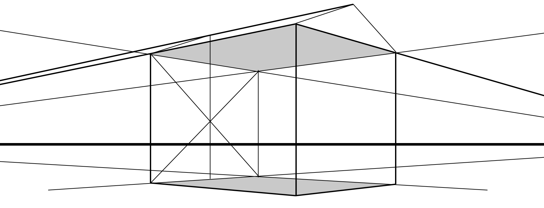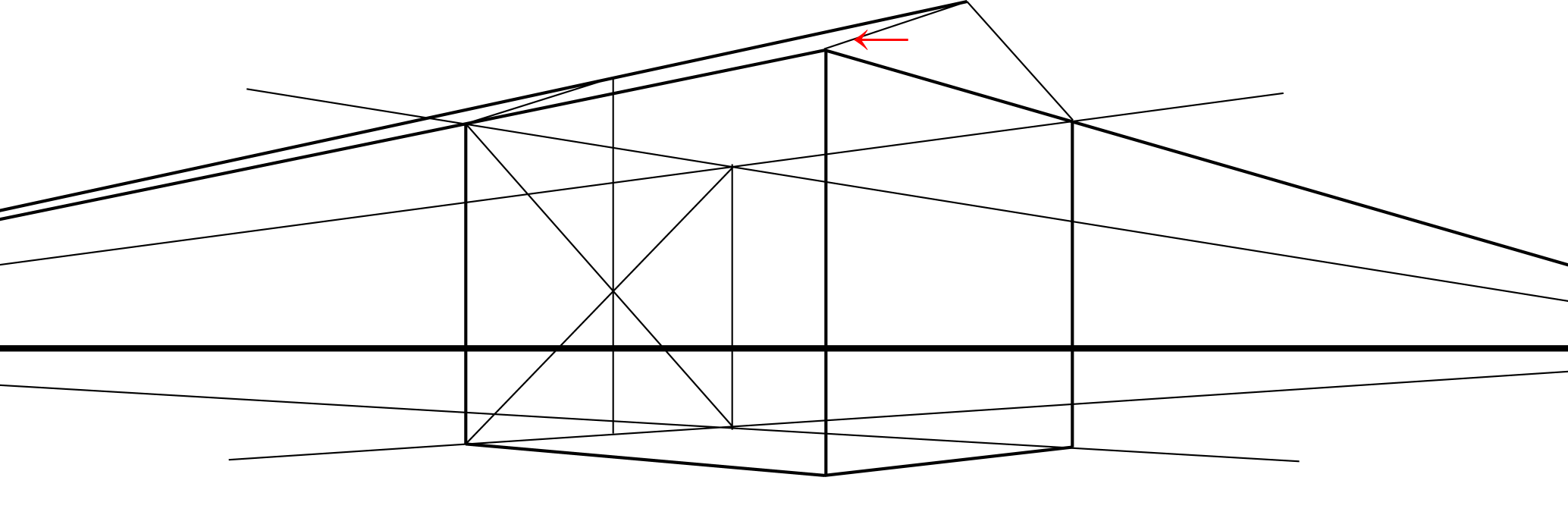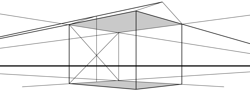 四角の対角線を引く事で図形の「中心」を探し、天井の中心を確認する事で、正確な屋根の高さを描く事が出来ます。