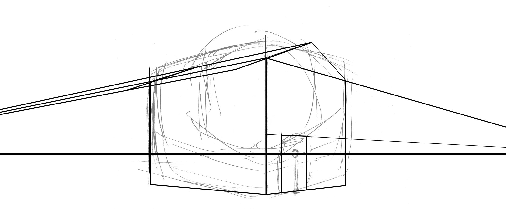 ※前面の屋根の線( ←の辺り) を正確に用いる事で、少し楽に描く事は出来ます。
