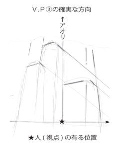 三点透視図法だけのルールとして、V.P③はE.Lの水平線を基準に人を配置した場所から、アオリ・フカンの図案により90 度( 真上、真下) の何れかの方向に現れます。