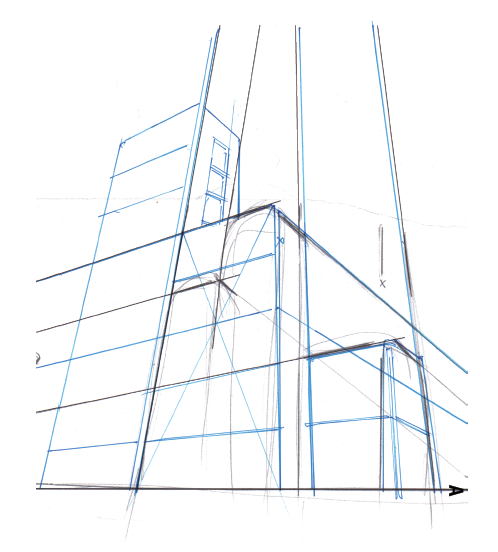 後は窓などの描き込みですが、ラフから描き、その線を感パース®でアタリをつけたら、より自然に見える正確なパースで描き入れたら完成です。