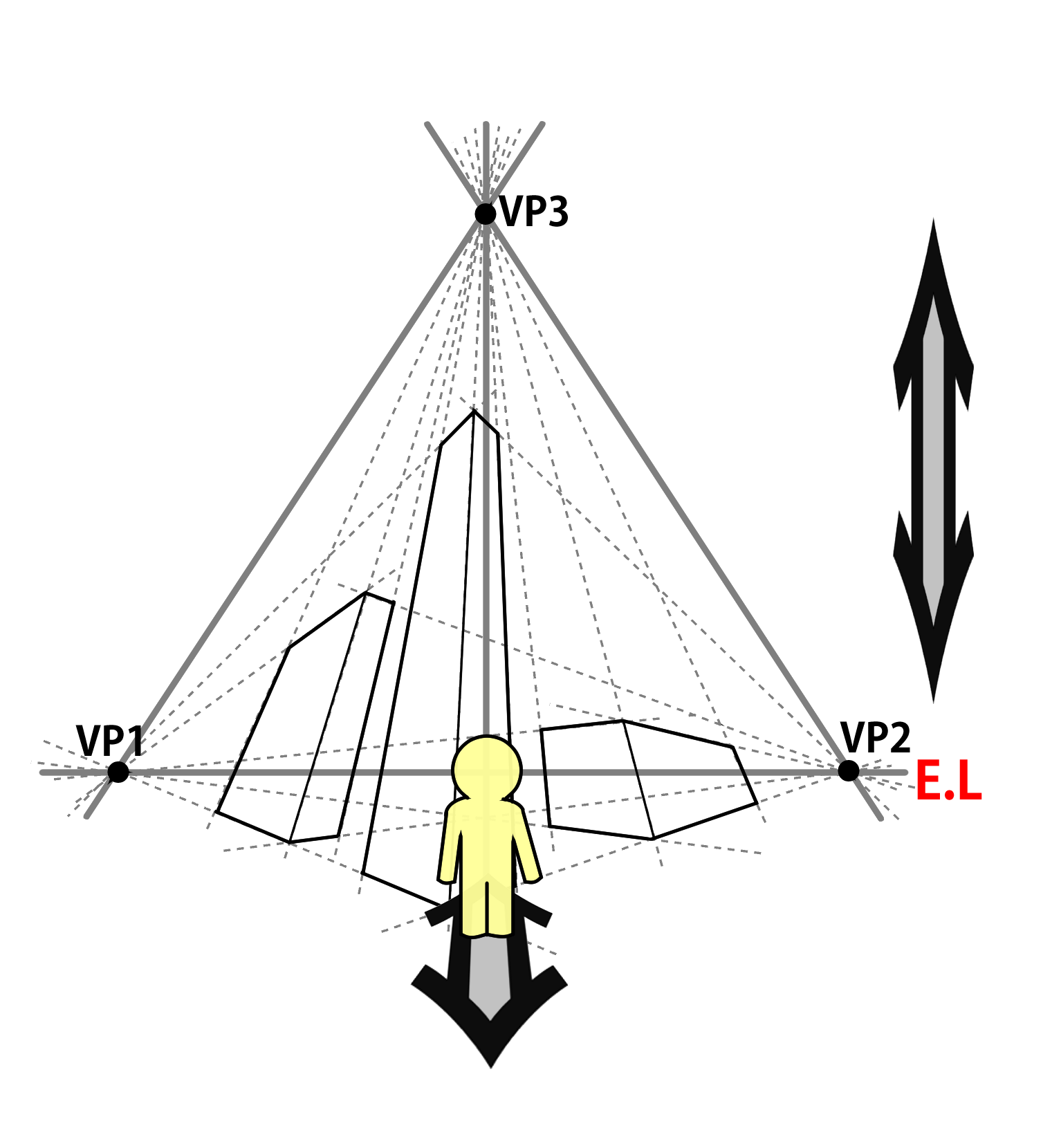 三点透視図法だけのルールとして、V.P③はE.Lの水平線を基準に人を配置した場所から、アオリ・フカンの図案により90 度( 真上、真下) の何れかの方向に現れます。