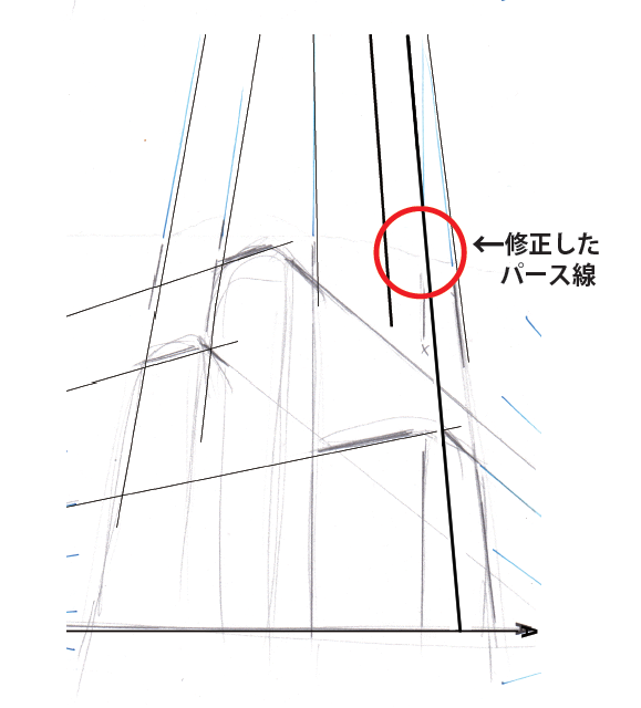 もし、アタリ線が明らかに方向が違う場合は(赤○で囲んだ×印)、紙の際の感パース®で修正して行きます。
