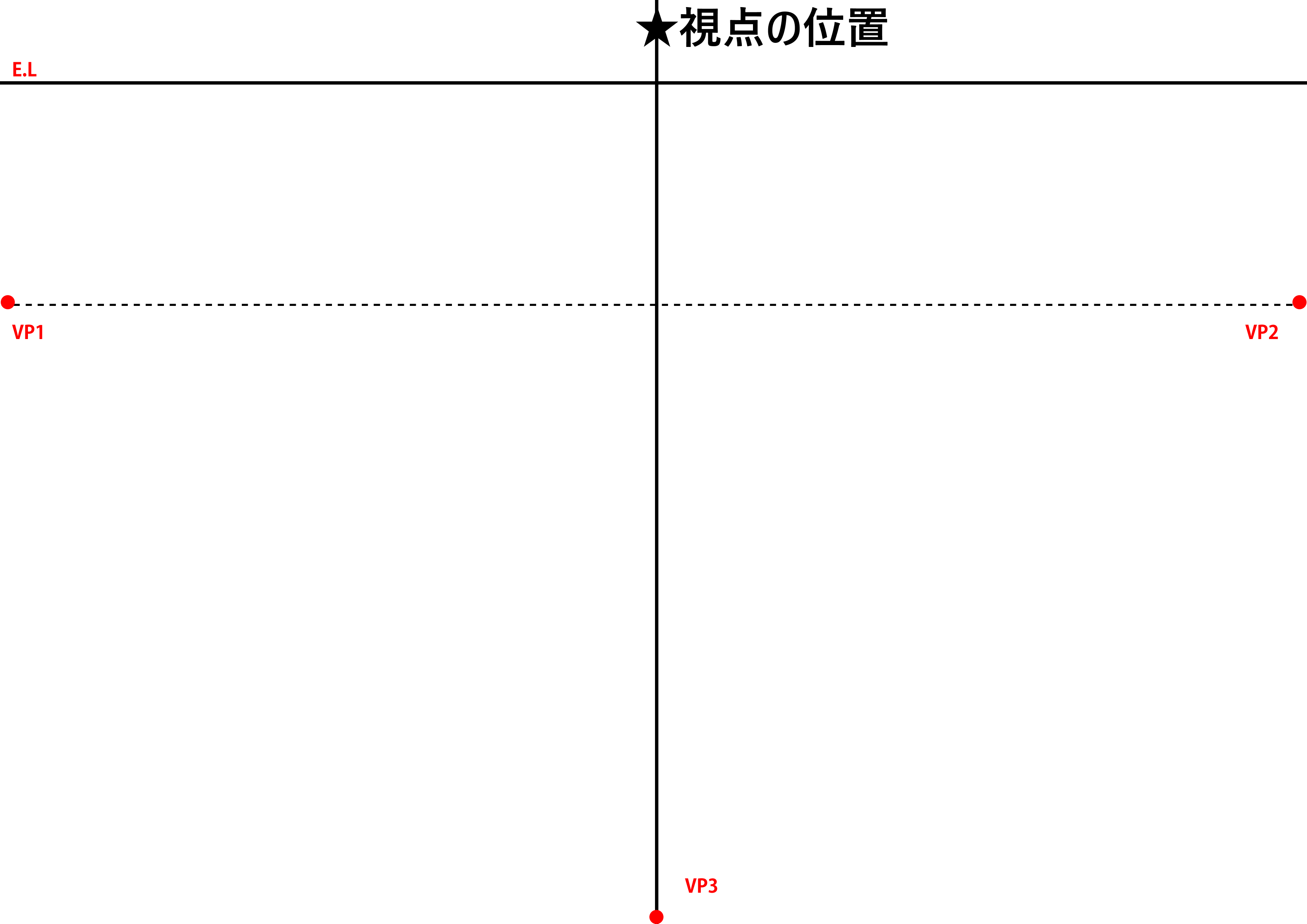 物体( 建物や部屋) がそれぞれのVP に近すぎると「(パースが)キツイ画角」になりますので、注意しましょう。