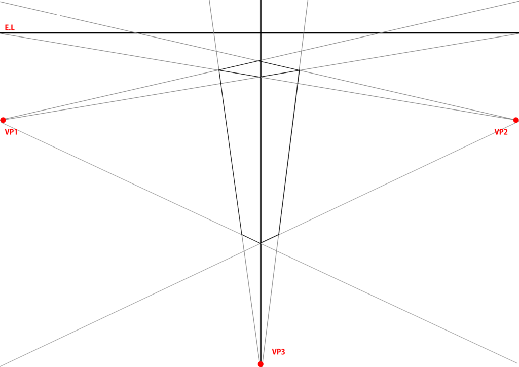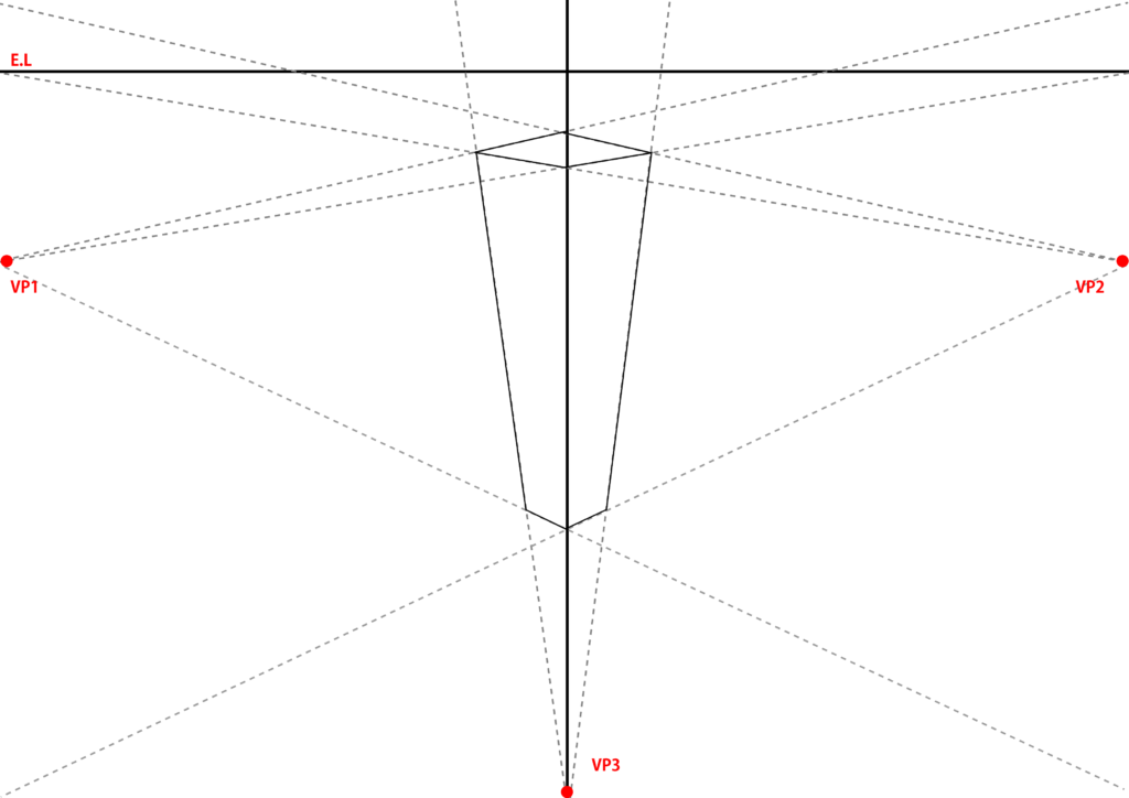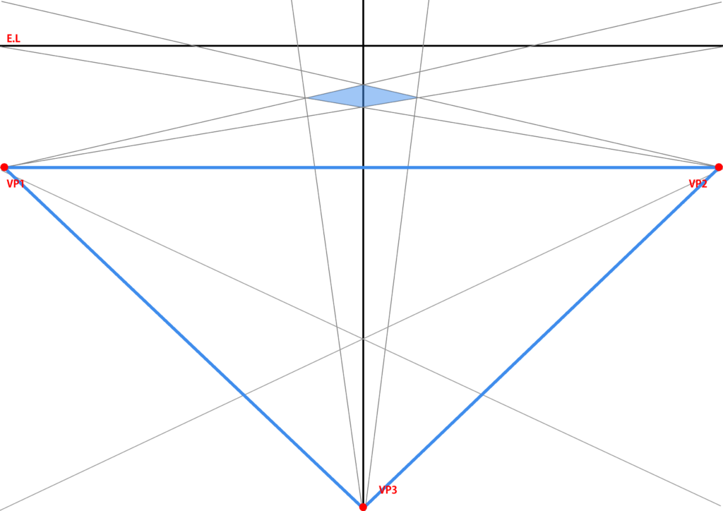 3つの消失点を繋げると三角形になりますので、二等辺三角形をイメージして引きましょう。