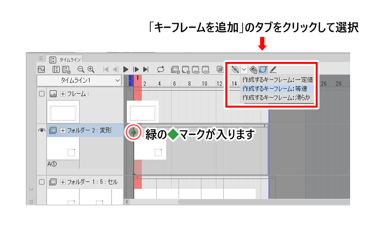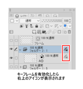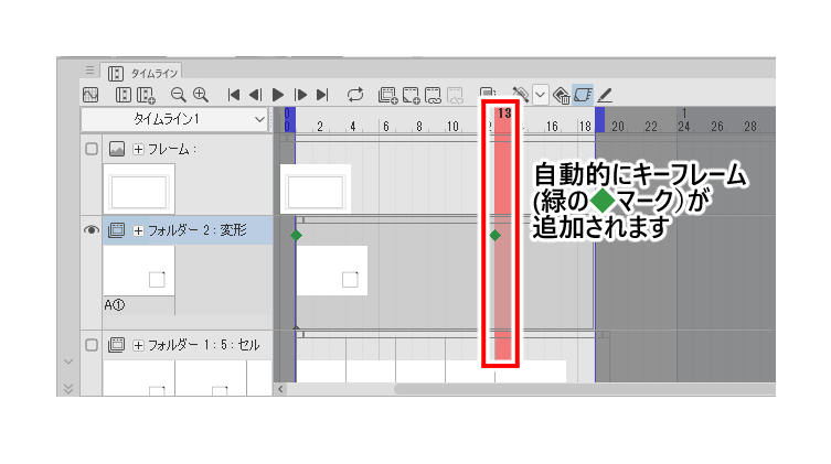 選択中のレイヤーやアニメーションフォルダに対して、キーフレームの編集が有効になります。